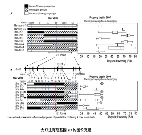 大豆分子設計育種重點實驗室夏正俊研究員及其合作者,歷經(jīng)九年,通過圖位克隆法成功地破譯大豆光周期反應的中樞調節(jié)基因E1,并對其進行了功能驗證。研究結果表明E1基因是豆科作物特有的轉錄因子,揭示了大豆具有獨特的光周期調控開花網(wǎng)絡。主要研究結果發(fā)表在2012年Proc Natl Acad Sci USA 109(32): E2155–E2164 (doi:10.1073/pnas.1117982109),被國內外大豆研究者及育種家評論為在大豆光周期反應研究中一個重要里程碑。