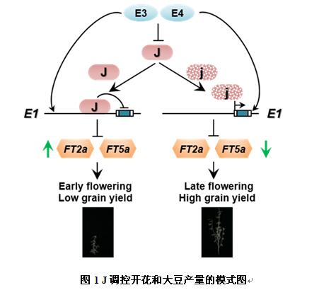 E3E4誘導(dǎo)調(diào)控E1是通過E3E4抑制調(diào)控J轉(zhuǎn)錄表達(dá),然后J抑制調(diào)控E1轉(zhuǎn)錄表達(dá)來完成,J蛋白能夠直接結(jié)合到E1啟動子上抑制其表達(dá),從而釋放了E1對FT轉(zhuǎn)錄抑制,而誘導(dǎo)大豆開花與成熟。