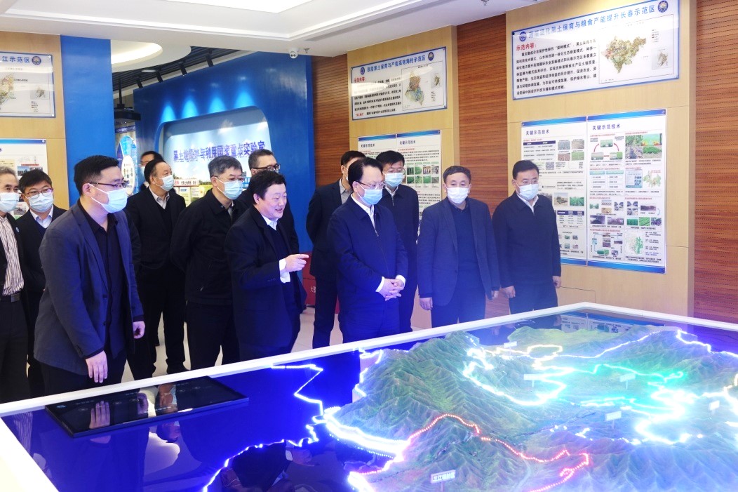在“黑土糧倉(cāng)”科技會(huì)戰(zhàn)指揮中心,東北地理所所長(zhǎng)姜明介紹了科技會(huì)戰(zhàn)核心技術(shù)攻關(guān)和區(qū)域適宜性模式示范組織框架以及黑土地保護(hù)與利用國(guó)家重點(diǎn)實(shí)驗(yàn)室籌建模式。景俊海觀看了“黑土糧倉(cāng)”科技會(huì)戰(zhàn)沙盤和指揮控制平臺(tái)演示,要求及時(shí)總結(jié)推廣黑土地保護(hù)工作的好經(jīng)驗(yàn)好做法,促進(jìn)我省黑土地質(zhì)量整體提升。