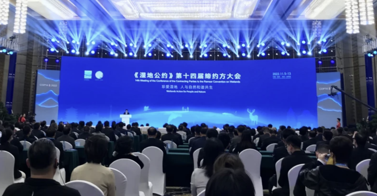 2022年11月5日至13日,《濕地公約》第十四屆締約方大會(COP14)在中國湖北武漢和瑞士日內瓦同步舉行,主題為“珍愛濕地,人與自然和諧共生”。中國國家主席習近平以視頻方式出席大會開幕式并發表題為《珍愛濕地 守護未來 推進濕地保護全球行動》的致辭。中國作為東道國組織了大會開幕式、部級高級別會議、中國濕地成就展、中國系列邊會,并正式通過了凝聚各方共識、展示全球意愿的《武漢宣言》。