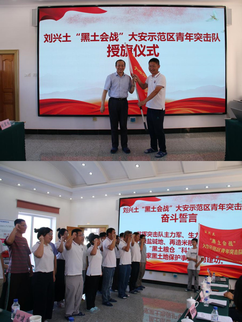 座談會(huì)上舉辦了以老科學(xué)家命名的突擊隊(duì)授旗儀式。文波龍副研究員簡(jiǎn)要介紹劉興土院士先進(jìn)事跡,李和風(fēng)向劉興土“黑土?xí)?zhàn)”大安示范區(qū)青年突擊隊(duì)授旗,青年突擊隊(duì)進(jìn)行奮斗誓言宣誓,錚錚誓言,體現(xiàn)了新一代的科研工作者以老科學(xué)家精神為引領(lǐng),緊密?chē)@國(guó)家重大戰(zhàn)略需求奮勇建功的信心和決心。
