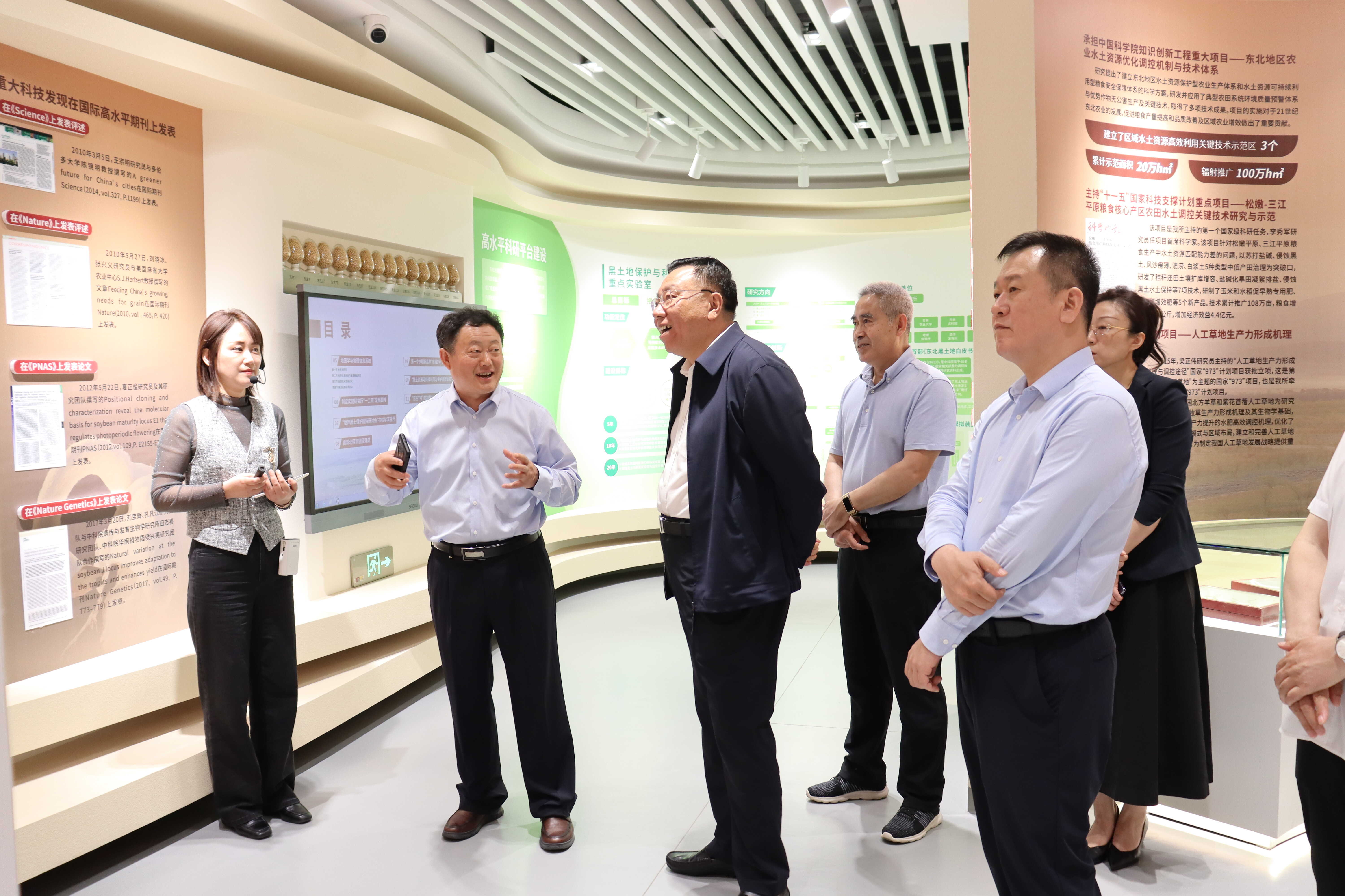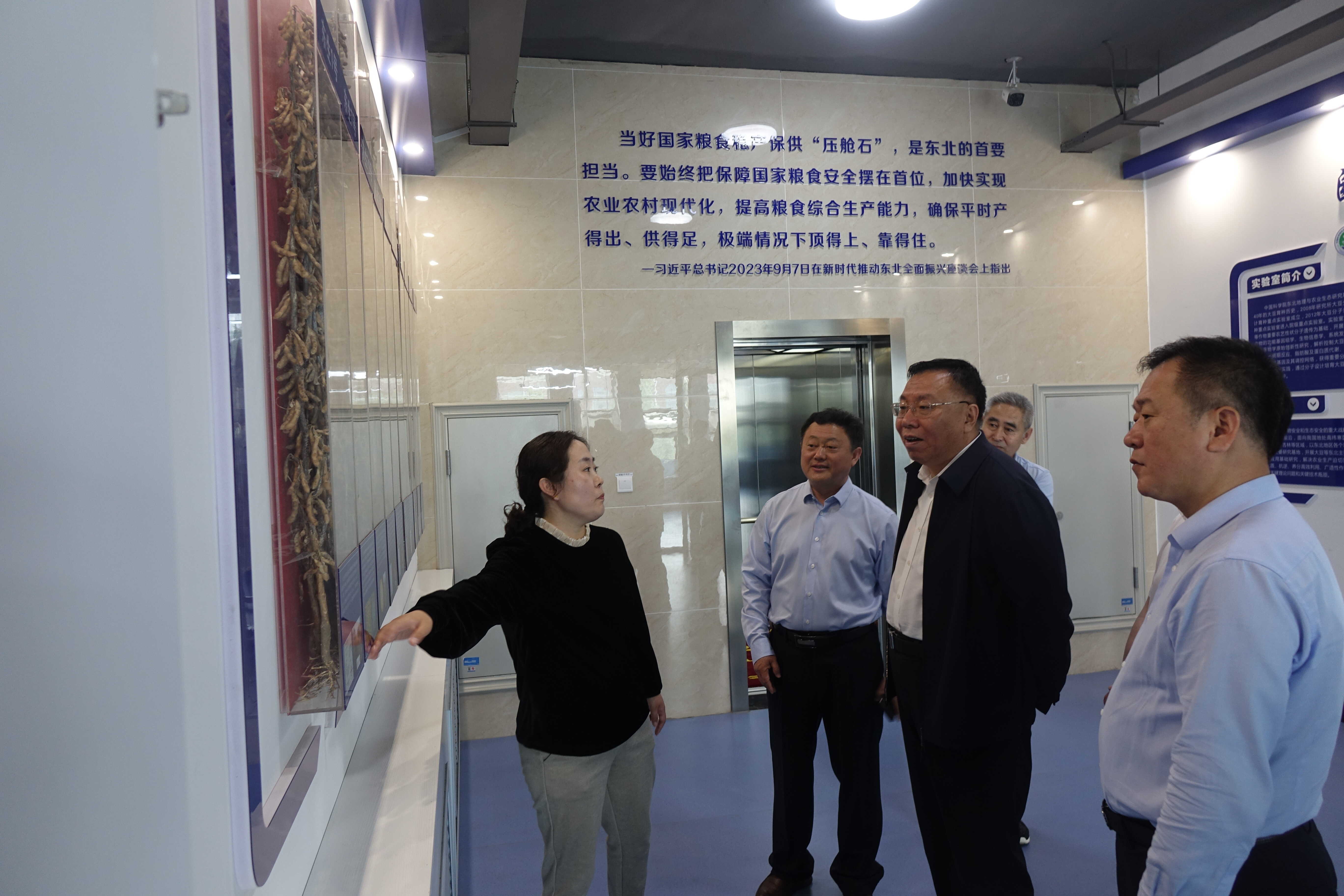 ????在農(nóng)業(yè)樓,郭靈計聽取了鹽堿地綜合治理技術(shù)、耐鹽堿種質(zhì)資源及新品種等工作進展匯報。在種質(zhì)資源樓,調(diào)研了大豆分子設(shè)計育種重點實驗室,現(xiàn)場查看了大豆基因突變體庫、大豆分子設(shè)計育種技術(shù)體系、高通量作物表型組分析系統(tǒng)及“東生”系列大豆新品種選育與轉(zhuǎn)化工作。在研究所展館,聽取了研究所歷史沿革、學(xué)科布局、承擔(dān)任務(wù)、科技平臺、人才隊伍、黨建工作及發(fā)展規(guī)劃等情況的介紹。在“黑土糧倉”科技會戰(zhàn)指揮中心,李祿軍結(jié)合會戰(zhàn)指揮平臺,介紹了“黑土糧倉”科技會戰(zhàn)背景、組織模式、區(qū)域適宜性技術(shù)模式及示范推廣等工作成績。