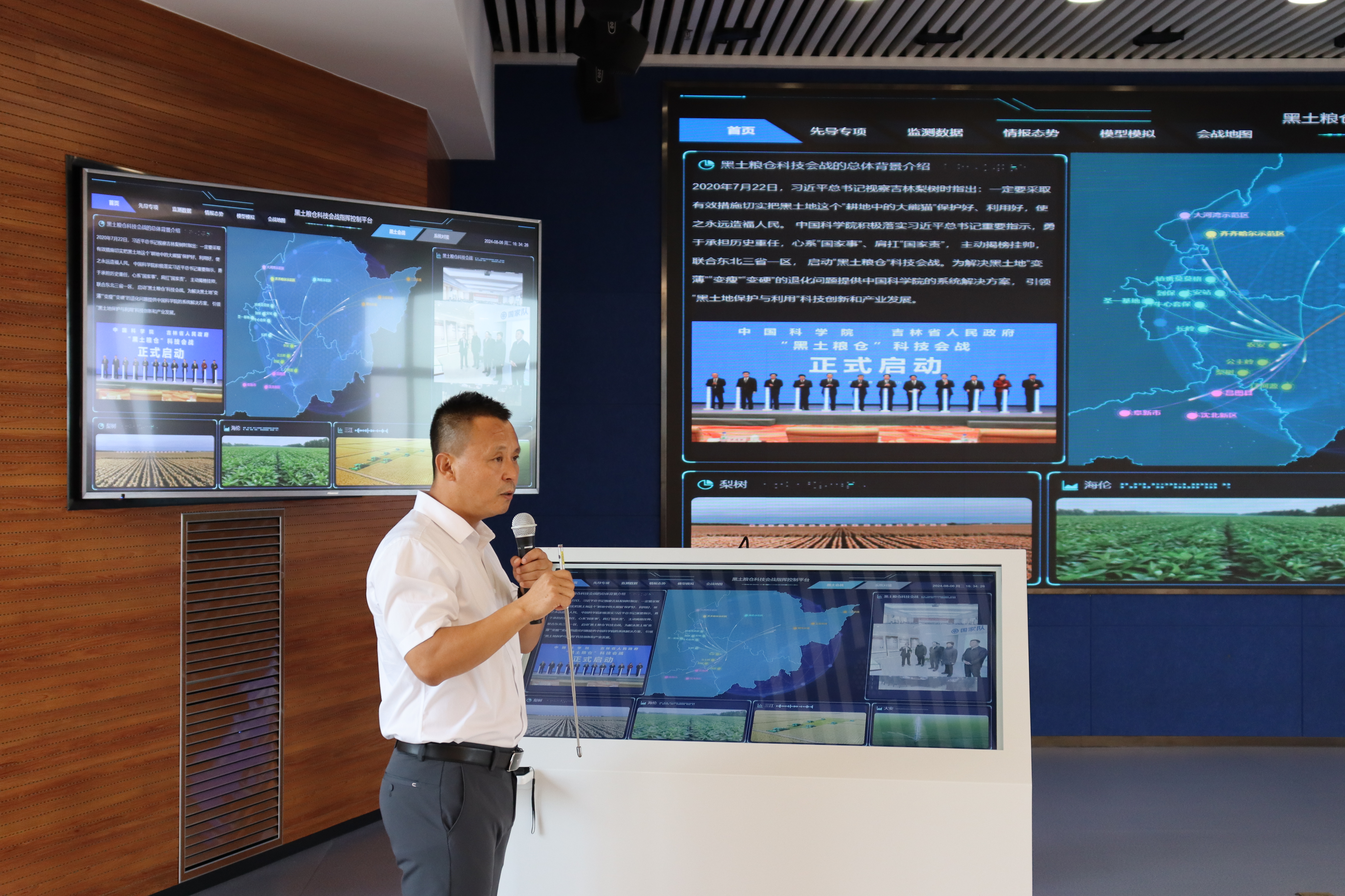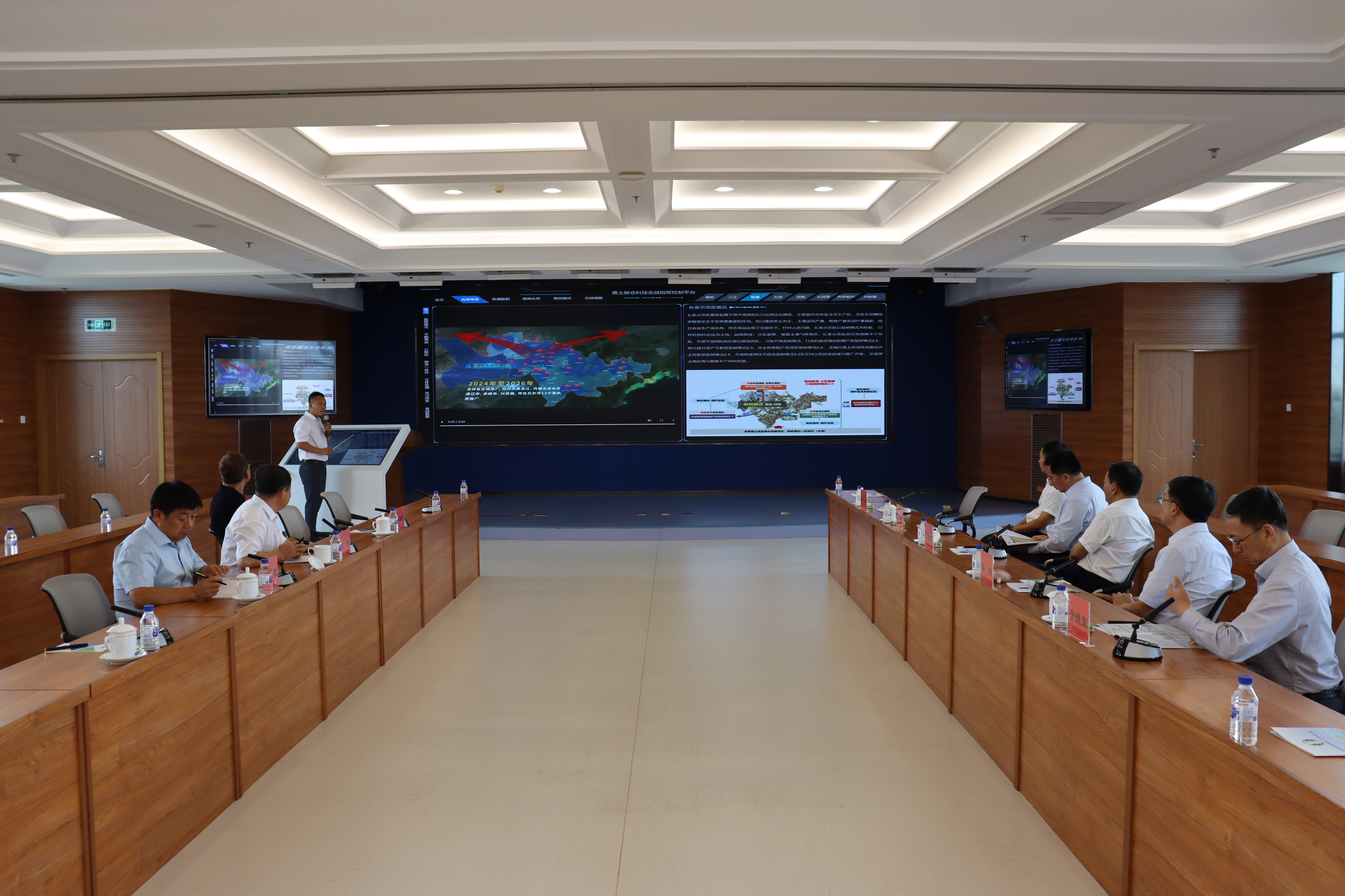 在“黑土糧倉”科技會(huì)戰(zhàn)指揮中心,調(diào)研組一行察看了黑土?xí)?zhàn)主要產(chǎn)品。重大項(xiàng)目辦公室主任崔明星結(jié)合黑土糧倉科技會(huì)戰(zhàn)指揮平臺(tái),介紹了“黑土糧倉”科技會(huì)戰(zhàn)背景、組織模式、區(qū)域適宜性技術(shù)模式及示范推廣等工作成績(jī),演示了科技會(huì)戰(zhàn)指揮系統(tǒng)。