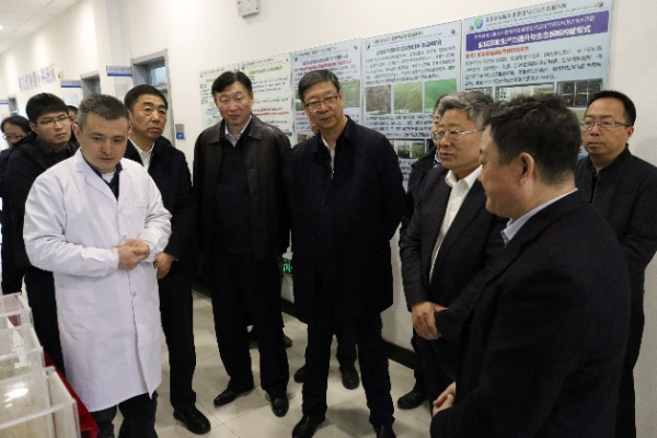 在農(nóng)業(yè)樓二樓,調(diào)研組聽取了蘇打鹽堿地改良技術(shù)的最新進展匯報。研究人員詳細介紹了土壤改良劑研發(fā)、耐鹽堿作物篩選及生態(tài)修復工程實施成效,重點展示“以稻治堿”“以草治堿”等技術(shù)的創(chuàng)新應用與規(guī)模化推廣成果。孫東生強調(diào)要加快技術(shù)標準化進程,為鹽堿地資源高效利用提供科技支撐。