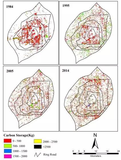 研究團隊應用遙感與實地測量相結合的方法,構建了城市森林碳儲量時空估測模型,揭示了快速城市化過程中城市森林結構及其碳儲量的時空演變規(guī)律。研究發(fā)現(xiàn),快速城市化過程中,城市森林覆蓋度總體呈現(xiàn)出逐漸增加的變化趨勢,但其斑塊破碎化逐漸加重;城市森林郁閉度、葉面積、基部斷面積等都呈現(xiàn)出逐漸降低的變化趨勢。在城市森林減緩碳排放方面,研究團隊明確了快速城市化過程中城市森林在應對城市碳排放中的貢獻:在1984~2014年間城市森林碳儲量逐漸增多(大多集中于郊區(qū)),其年增加量為6Gg,可抵消年增加CO2排放量的4%。城市森林碳密度呈現(xiàn)出從郊區(qū)到中心逐漸降低的變化趨勢,但隨著時間的推移,城市森林質量有所提高,城市森林碳密度逐漸升高。