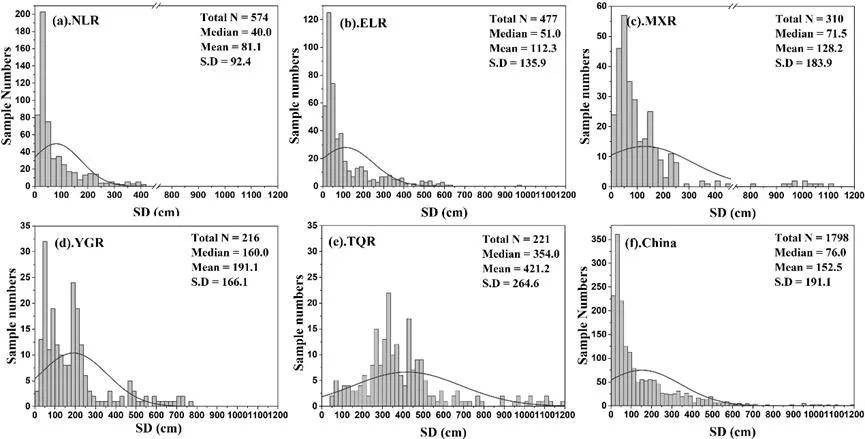 圖2 不同湖區湖泊透明度頻率直方圖