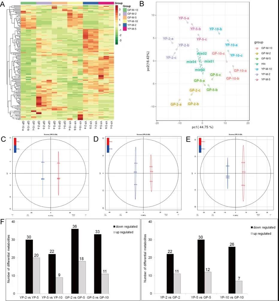 A:差異代謝物聚類分析;B: 差異代謝物的主成分分析(PCA);C、D、E:差異代謝物OPLS-DA分析;F:不同比較組間差異代謝物數量統計