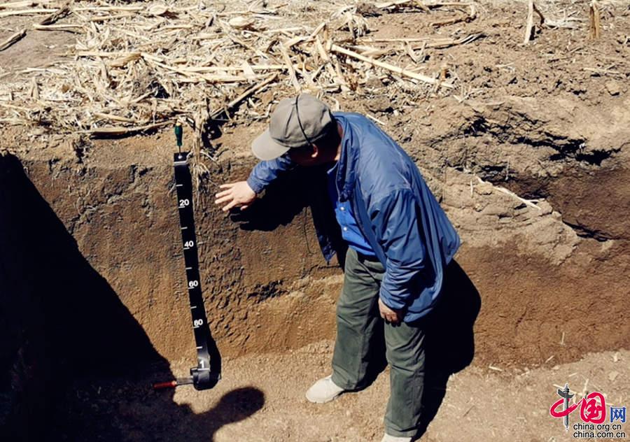 5月11日,探訪中國科學(xué)院“黑土糧倉”科技會(huì)戰(zhàn)“梨樹模式”示范區(qū)。圖為中國科學(xué)院沈陽生態(tài)所研究員張旭東在示范區(qū)基地介紹黑土地地下分層情況。王振紅攝