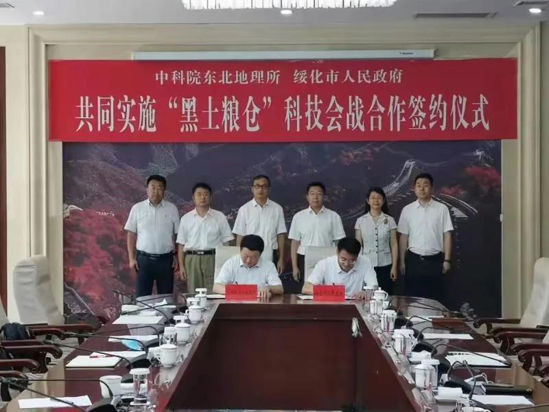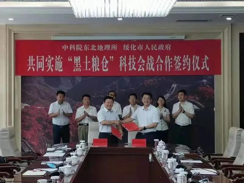 隨后,在孫恒義等領(lǐng)導和中科院東北地理所相關(guān)同志的共同見證下,孫飚代表綏化市人民政府與姜明所長正式簽訂共同實施“黑土糧倉”科技會戰(zhàn)合作協(xié)議。