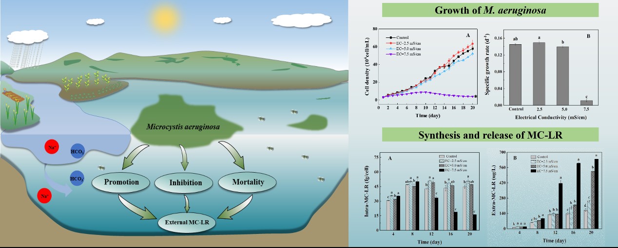 銅綠微囊藻(M.aeruginosa)是引起藍(lán)藻水華的優(yōu)勢藻種之一,其產(chǎn)生的微囊藻毒素(microcystins, MCs)嚴(yán)重威脅水生生物和人體健康。隨著鹽堿化地區(qū)土地資源的大規(guī)模開發(fā)利用,大量農(nóng)田退水和水產(chǎn)養(yǎng)殖廢水的排放將導(dǎo)致地表水體堿性鹽含量升高,對水體中銅綠微囊藻的生長和產(chǎn)毒過程可能會產(chǎn)生影響。但目前這方面的定量化研究還鮮有報道,其內(nèi)在的影響機(jī)制也不清楚。為此,東北地理所科研人員開展了鹽堿脅迫對銅綠微囊藻生長和產(chǎn)毒影響及機(jī)制的系統(tǒng)性研究,以期揭示不同強(qiáng)度堿性鹽脅迫對銅綠微囊藻生長、生理和細(xì)胞超微結(jié)構(gòu)的影響,量化胞內(nèi)外微囊藻毒素LR(MC-LR)的含量變化,闡明銅綠微囊藻對堿性鹽脅迫的響應(yīng)機(jī)制。