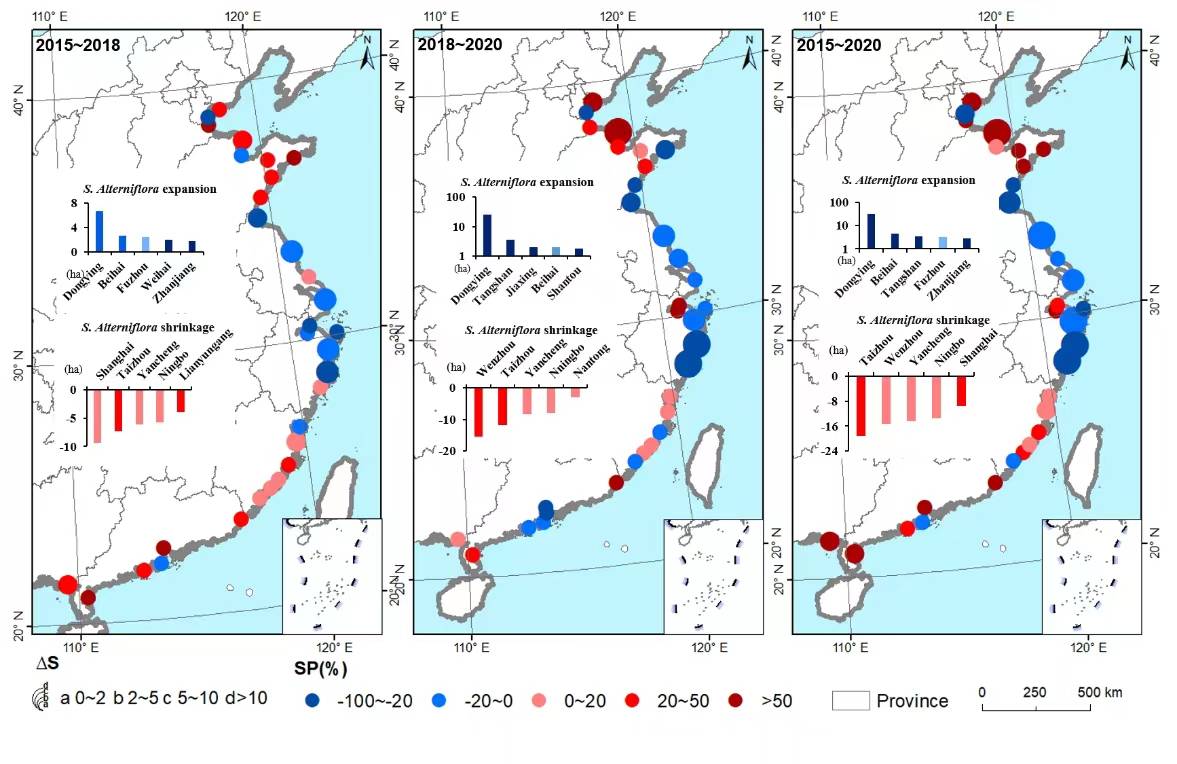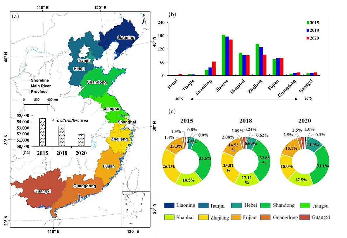 圖1. 2015、2018和2020年中國(guó)沿海省份互花草入侵情況(a)、各省互花米草面積變化(c)、各省互花米草占比。