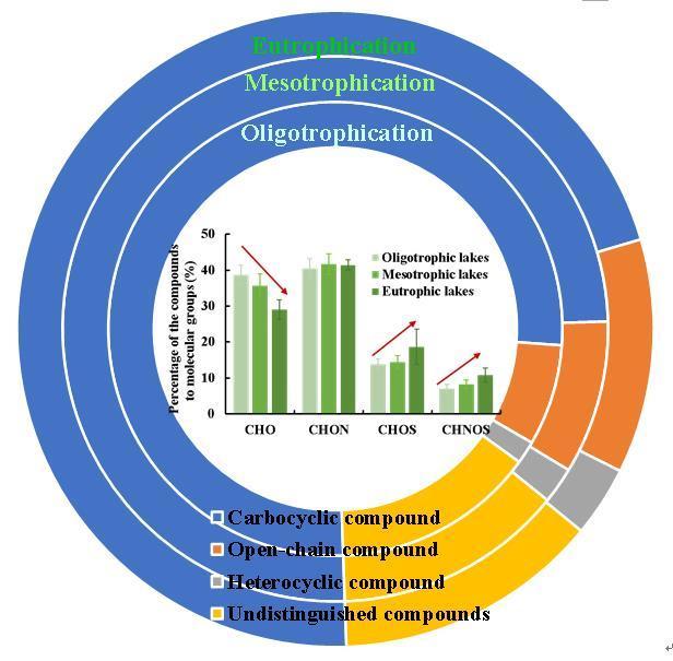 結果表明,富營養化使水體DOM分子構成中的CHO%含量減少,含硫元素的雜原子化合物(CHOS%和CHNOS%)含量增加;富營養化湖泊中夏季水體DOM的分子穩定性要高于秋季,這與浮游植物群落的季節性演替有關;富營養化水體中,DOM的主要組分為高度不飽和化合物為主、O3S+O5S化合物和富羧基脂環化合物(CRAMs),這是內源DOM(浮游植物衍生)被進一步生物轉化的產物,湖泊富營養化可能會導致水體中難降解DOM化合物逐漸增多。目前全球范圍內水體富營養化現象逐漸加劇,本研究結果為闡明湖泊DOM在未來全球碳循環中的作用提供了重要的理論支撐。