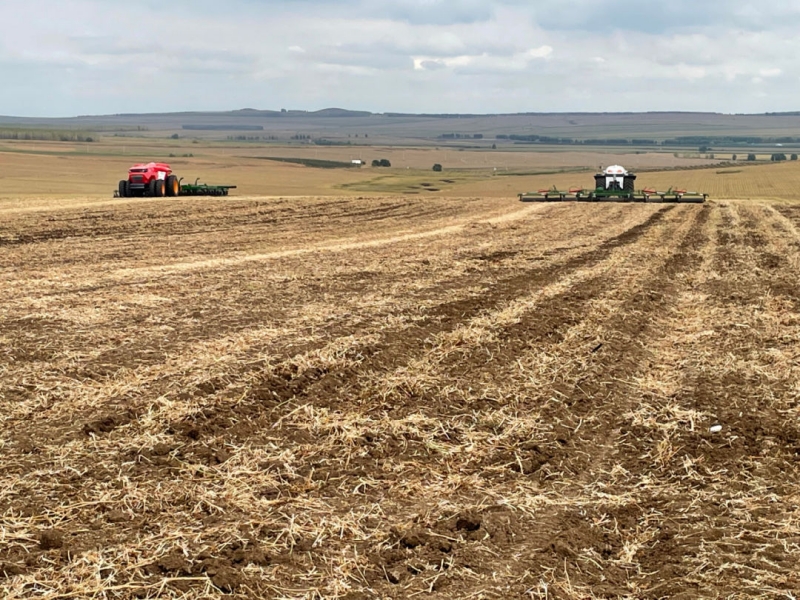 9月17日,無人駕駛的鴻鵠T300(左紅色)搭載液壓圓盤重耙馳騁在一望無際的大河灣農牧場驚艷亮相。右邊,是無人駕駛的鴻鵠T150機頭帶著“伽馬能譜土壤養分快速檢測儀”,后邊是鎮壓機。