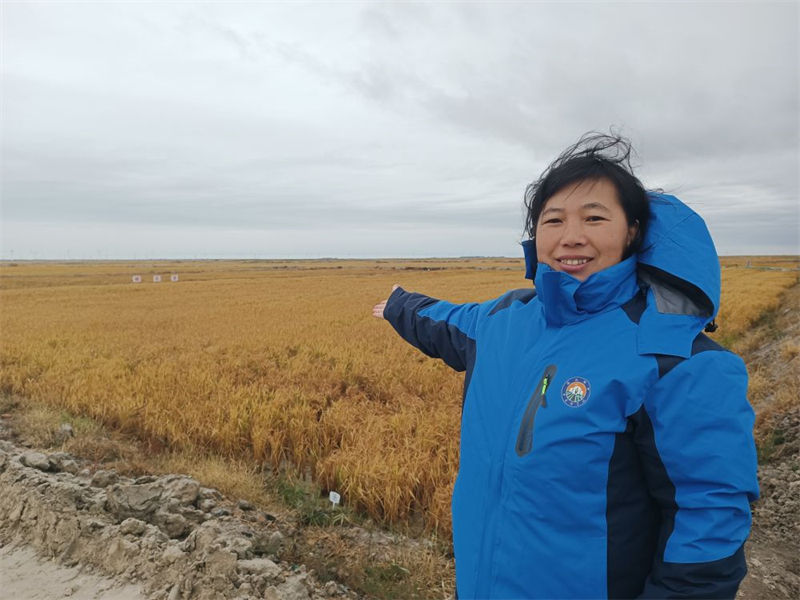 中科院東北地理所高級工程師劉淼在大安市海坨鄉互助村鹽堿地土壤改良試驗示范基地展示改良后的稻田。新華社記者 李雙溪 攝