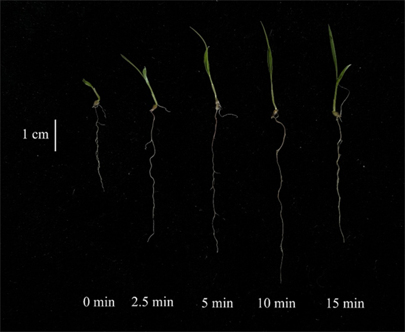 圖7 不同煙熏時(shí)間對(duì)狗尾草幼苗生長的影響(作者拍攝)