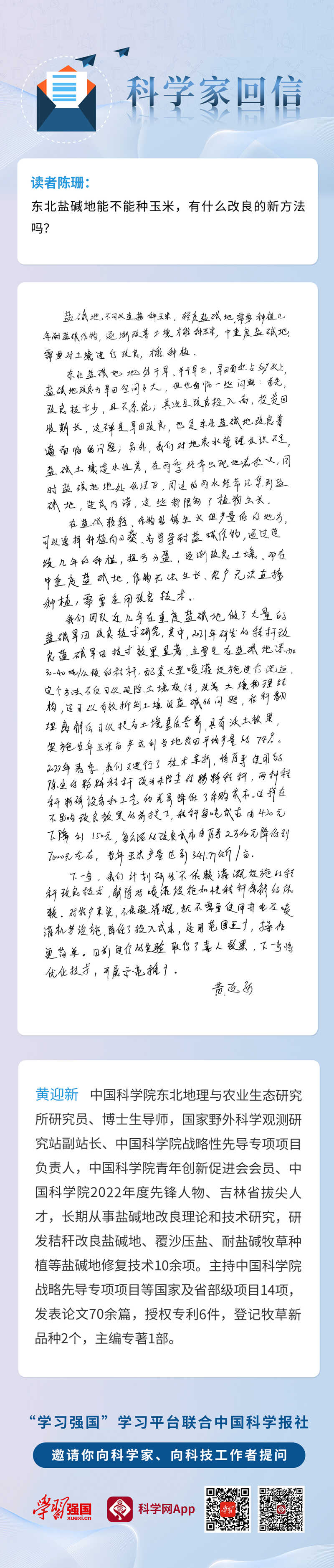【科學(xué)網(wǎng)】科學(xué)家回信|黃迎新:鹽堿旱田改良潛力巨大