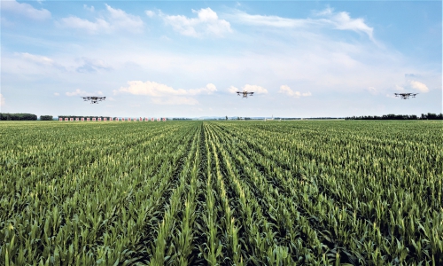 “梨樹模式”百萬畝核心綠色玉米生產基地無人機飛防。