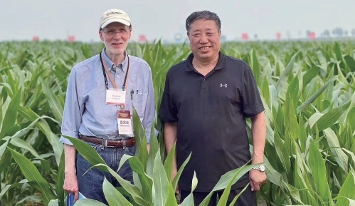 吉林省農業科學院全國玉米栽培和黑土地保護專家王立春(右)在公主嶺黑土地保護實驗基地接待美國土壤學會理事長湯普森,為其講解吉林省黑土地保護技術。