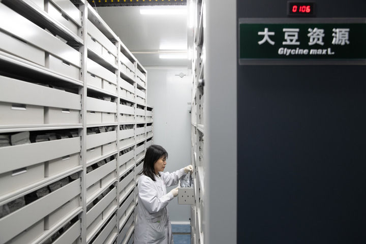 2024年4月2日,工作人員在國家寒帶作物及大豆種質資源中期庫(哈爾濱)查看大豆種質情況。新華社記者張濤攝