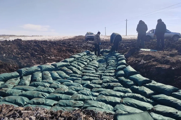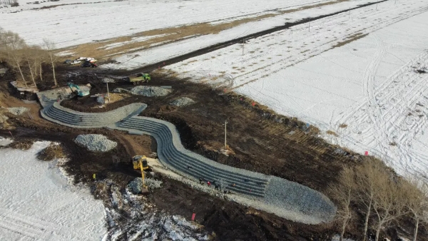 在黑龍江省克山縣華安村,工人們正抓緊建設(shè)溝頭跌水中的上游生態(tài)袋導(dǎo)水地下工程。農(nóng)民日報·中國農(nóng)網(wǎng)記者 顏旭 攝