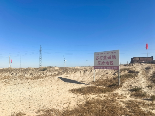 示范區里,一條窄窄的土路,隔開兩片天地——一邊是保留下來的蘇打鹽堿地原始面貌,堿斑累累,寸草不生;另一邊則谷穗低垂,滿載希望。