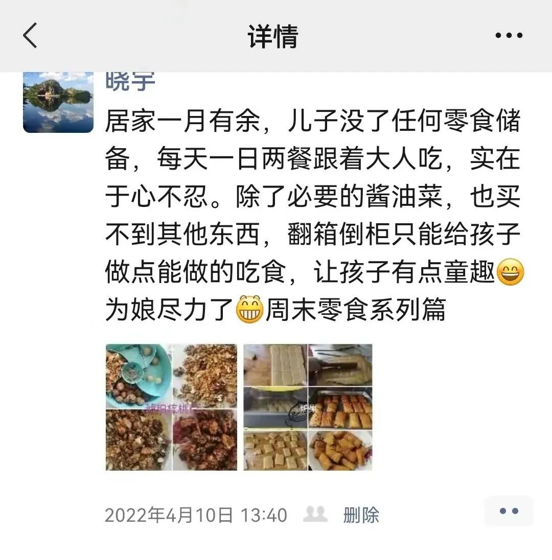 自二月九日離家以來,我們每天都保持互動,曬三餐美食,我夸您的葷素搭配,您羨慕我的“不勞而獲”。所區封閉后,看到我早餐的包子、餅、小菜、粥,和午餐晚餐的一葷兩素,米飯和饅頭任選,您還感嘆能在靜態管理的長春,吃到這么好的飯菜,真是非常幸福的啊。是的呢,在所里的我們就像在家長庇護下的孩子,不愁吃穿,就如兒時您說我可以在您的懷抱中沒有煩惱。
