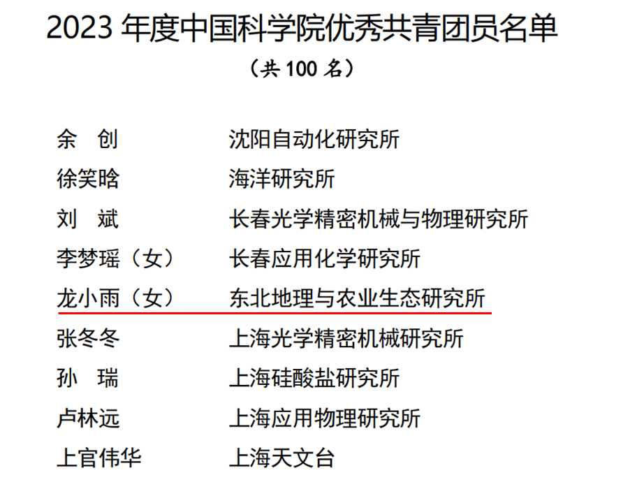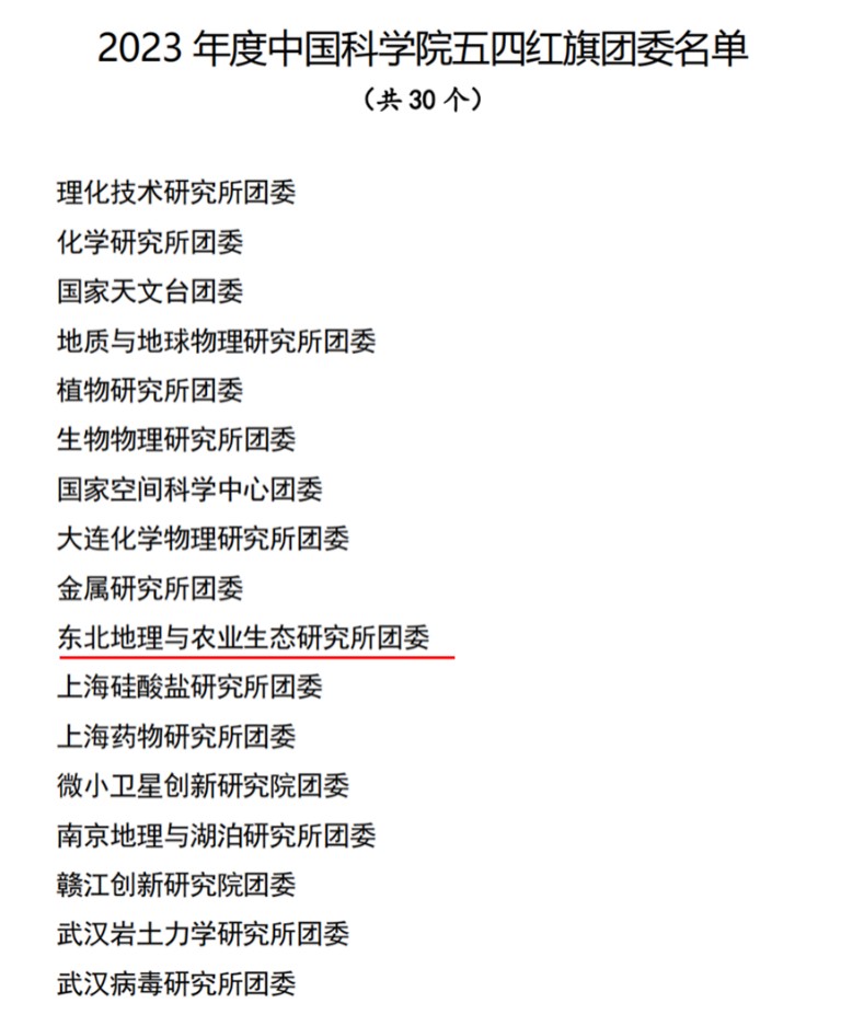 為表彰先進(jìn)、樹立典型,激勵團(tuán)青組織和廣大團(tuán)員、團(tuán)干部奮勇爭先、再創(chuàng)佳績。近日,中國科學(xué)院團(tuán)委發(fā)文對30個五四紅旗團(tuán)委、30個五四紅旗團(tuán)支部、50名優(yōu)秀共青團(tuán)干部、100名優(yōu)秀團(tuán)員青年進(jìn)行表彰。中國科學(xué)院東北地理與農(nóng)業(yè)生態(tài)研究所團(tuán)委榮獲“2023年度五四紅旗團(tuán)委”稱號、2023級博士研究生龍小雨榮獲“2023年度中國科學(xué)院優(yōu)秀共青團(tuán)員”稱號。