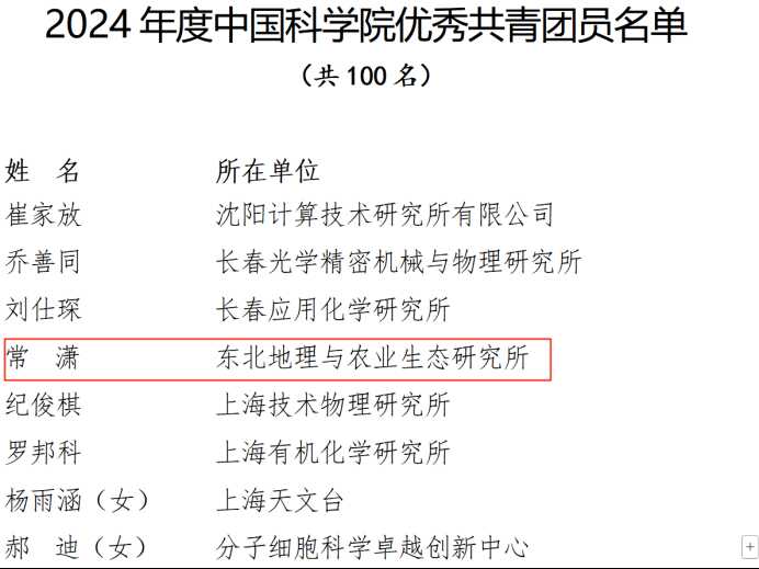 為表彰先進、樹立典型,激勵團青組織和廣大團員、團干部奮勇爭先、再創佳績。近日,中國科學院團委發文對29個五四紅旗團委、30個五四紅旗團支部、50名優秀共青團干部、100名優秀團員青年進行表彰。中國科學院東北地理與農業生態研究所團委書記苑春宇榮獲“2024年度優秀共青團干部”稱號、2023級博士研究生常瀟榮獲“2024年度中國科學院優秀共青團員”稱號。