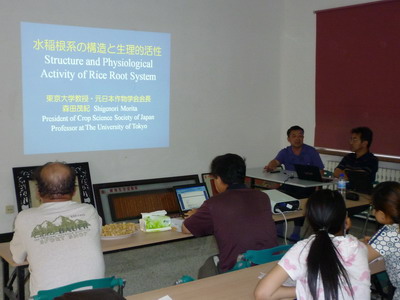 參觀結束后,在大安堿地生態試驗站三樓報告廳舉行了學術報告會。森田茂紀教授基于自己多年的研究成果做了題為《水稻根系構造與生理活性研究》的學術報告。楠谷彰人教授針對我國未來生活消費水平的提高對優質食味米的潛在需求做了題為《水稻食味米研究》的報告。他結合自己的研究介紹了水稻食味的鑒定方法,指出蛋白質含量和直鏈淀粉含量較低的品種在味覺、香味、黏度、硬度、外觀等方面均具有均衡的表現。塩津文隆博士以《日本利用水稻生產生物乙醇的產量潛力估算》為題,詳細闡述了日本利用農業棄耕地種植水稻生產生物乙醇的生產潛力,并從品種類型選擇及栽培角度提出了提高水稻生產生物乙醇效率的技術途徑與措施。