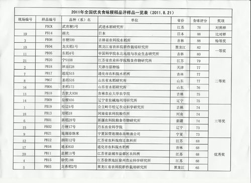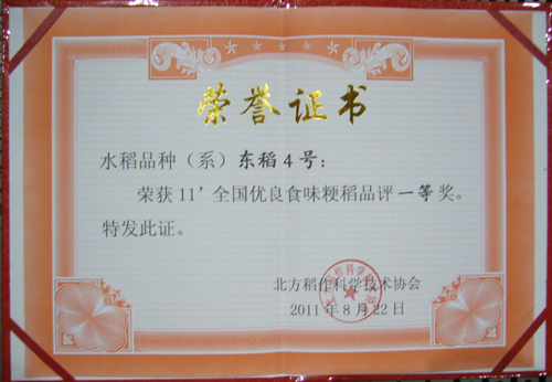 2011年8月21-24日,由北方稻作科學(xué)技術(shù)協(xié)會(huì)組織國(guó)內(nèi)外稻米品嘗專家20人,針對(duì)來(lái)自全國(guó)各地參評(píng)的優(yōu)良粳稻審定品種,從米飯的氣味(香氣),外觀結(jié)構(gòu)(米飯顏色、光澤、米粒完整性),適口性(粘性、軟硬度、彈性)和味道(滋味、純正性與持久性)四個(gè)方面進(jìn)行單項(xiàng)7個(gè)等級(jí)進(jìn)行評(píng)分,最后以綜合評(píng)分的平均值作為米飯食用品質(zhì)感官評(píng)比結(jié)果,按照事先確定好的綜合得分85以上為特等獎(jiǎng),80-85分為一等獎(jiǎng),75-80分為二等獎(jiǎng),70-75分為三等獎(jiǎng),65-70分為優(yōu)秀獎(jiǎng)的評(píng)選標(biāo)準(zhǔn)。經(jīng)過評(píng)委們一天認(rèn)真的品嘗,最終共評(píng)選出特等獎(jiǎng)1個(gè)(與日本越光品種同為88分),一等獎(jiǎng)2個(gè),二等獎(jiǎng)7個(gè),三等獎(jiǎng)5個(gè),優(yōu)秀獎(jiǎng)5個(gè)。我所培育的“東稻4號(hào)”水稻品種以80分的好成績(jī)獲得一等獎(jiǎng)。
