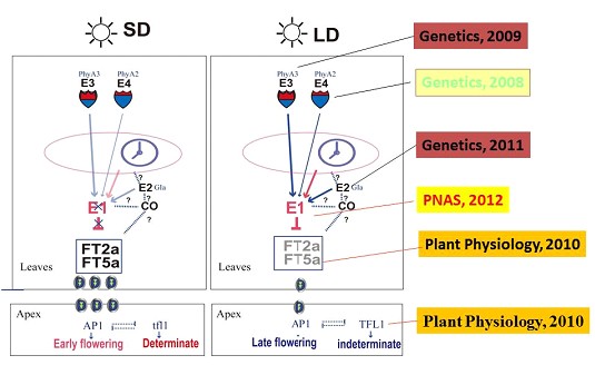 植物光周期現(xiàn)象(photoperiodism)是指植物通過感受晝夜長(zhǎng)短而控制植株內(nèi)部生理反應(yīng)過程,其中研究較多的是植物通過感受晝夜長(zhǎng)短變化而控制開花。大豆起源于我國(guó),是早期研究光周期現(xiàn)象的重要模式植物。大豆生育期基因E1與大豆光周期反應(yīng)關(guān)系密切,同時(shí)對(duì)大豆的開花期及成熟期的影響最大。由于該基因位于第六染色體的近中心粒附近,其遺傳重組率極低,該基因自1971年正式定名來,長(zhǎng)期未能揭開其神秘的面紗。夏正俊等研究者花近八年時(shí)間經(jīng)傳統(tǒng)的圖位克隆法成功地克隆了該基因,其研究論文發(fā)表在PNAS上(2012年109:E2155-64)。結(jié)果表明E1基因含有一個(gè)雙邊的(Bipartite)核定位信號(hào)(NLS),并含有一個(gè)與B3遠(yuǎn)緣相關(guān)的結(jié)構(gòu)域,為豆科作物所特有的基因序列,預(yù)示著大豆中可能存在著與水稻及擬南芥不同的光周期調(diào)控開花途徑。一位審稿專家指出:本研究對(duì)于我們認(rèn)識(shí)不同植物在調(diào)控開花上如何進(jìn)化是一個(gè)重要里程碑式的工作,展示了植物如何調(diào)控開花的一個(gè)全新的概念,因而引發(fā)人們的普遍及濃厚的興趣。加拿大Cober教授評(píng)述說,E1基因的克隆不僅對(duì)于對(duì)光周期理論意義重大,使育種有了具體的分子目標(biāo)。我國(guó)大豆產(chǎn)業(yè)體系首席專家韓天富評(píng)價(jià):E1基因的成功克隆是我國(guó)科學(xué)家對(duì)大豆光周期的重要貢獻(xiàn)。
