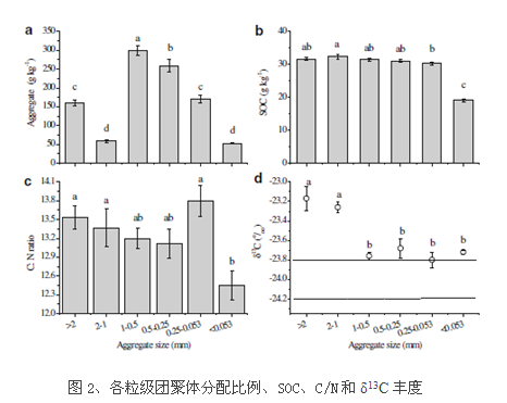 根際沉積碳是連接植物、土壤和微生物的紐帶,根際沉積碳作為根際微生態系統中的物質流、能量流和信息流,具有十分重要的作用。根際沉積碳的空間分布直接調控著根際效應,同時受作物根系吸收水分和土壤團聚過程的影響。目前,有關根際沉積碳在土壤孔隙、團聚體中的分配及在根際中遷移還不清楚。為此,我所土壤物質循環學科組喬云發副研究員等人,利用C3-C4轉換研究方法,在中國科學院海倫農業生態實驗站連作13年大豆C3土壤上種植C4作物玉米,采用田間13C-CO2脈沖標記方法,應用土壤當量孔徑與土壤水吸力的關系,結合土壤水穩性團聚體;利用穩定性同位素質譜測定試驗前后原土和各粒級水穩性團聚體SOC和δ13C豐度;利用壓力膜儀獲得不同土壤孔徑內土壤水含量,接合同位素質譜測定不同孔徑內土壤水的δ13C豐度;利用原狀土柱方法模擬根際土壤,從而系統研究了玉米根際沉積碳在土壤孔隙、團聚體和根際遷移機制。