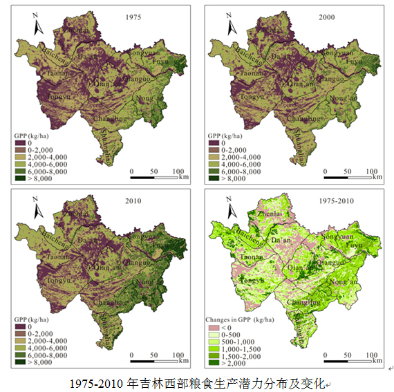 我所土地系統(tǒng)遙感學(xué)科組結(jié)合土地利用數(shù)據(jù)、氣象數(shù)據(jù)、土壤數(shù)據(jù)、DEM 數(shù)據(jù)和歷史統(tǒng)計資料等,采用全球農(nóng)業(yè)生態(tài)區(qū)(GAEZ)模型,估算了吉林西部糧食生產(chǎn)潛力,進(jìn)而分析了吉林西部糧食生產(chǎn)潛力對土地利用變化的響應(yīng)。研究結(jié)果表明,在1975-2010年間,由于氣候、土地利用和灌溉水平的變化,吉林西部糧食生產(chǎn)潛力呈增加趨勢;雖然耕地面積的增加提高了糧食生產(chǎn)潛力,但其作用要遠(yuǎn)小于氣候和灌溉水平的變化,而耕地增加的主要原因是草地和沼澤地被大面積地開墾為農(nóng)田,導(dǎo)致了生態(tài)環(huán)境惡化趨勢加劇。因此,僅僅管控耕地數(shù)量并非是保障糧食安全的最優(yōu)途徑,通過增加農(nóng)業(yè)投入,改善土地質(zhì)量,優(yōu)化土地利用格局,恢復(fù)生態(tài)環(huán)境,從而提高糧食生產(chǎn)潛力,應(yīng)是保障國家、區(qū)域糧食安全和實現(xiàn)土地可持續(xù)利用的更好選擇。