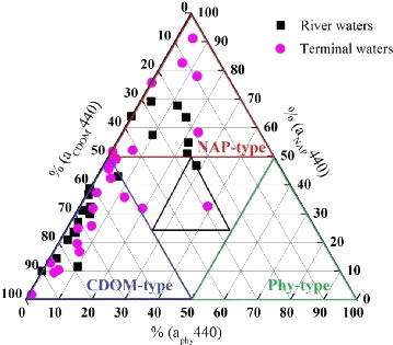 圖1 高原水體中CDOM、色素顆粒及無機顆粒物對非水性光學總吸收的貢獻率分析