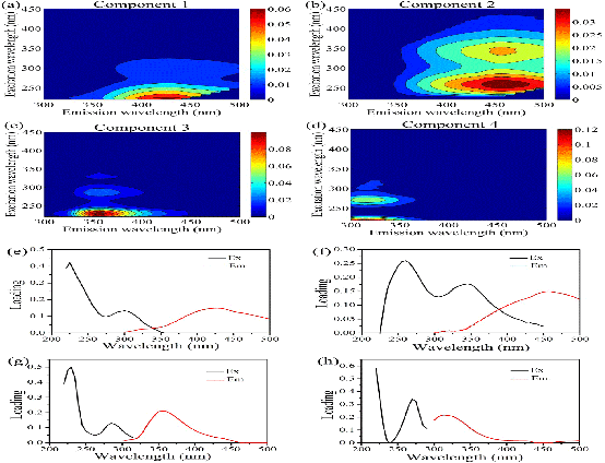 圖2 平行因子分析(PARAFAC)鑒別出的CDOM熒光組分等值線圖