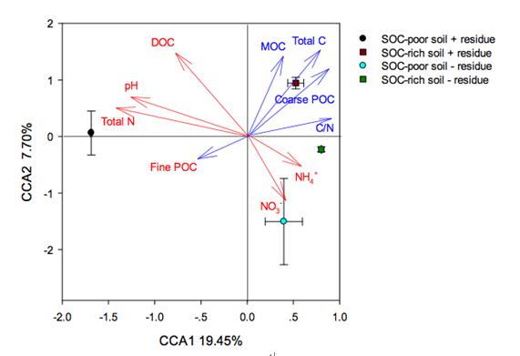 為此,東北地理所農(nóng)田分子生態(tài)學科組連騰祥博士在金劍研究員的指導下,采用13C標記示蹤技術(shù),在明確大豆根殘體向黑土土壤碳庫歸還量大于莖和葉殘體的基礎(chǔ)上(Lian et al., 2016, Biology and Fertility of Soils),進一步解析了13C標記的大豆莖稈殘體向低、高有機質(zhì)含量黑土(SOC含量分別為14和50 g/kg)的轉(zhuǎn)化情況。研究發(fā)現(xiàn)秸稈碳轉(zhuǎn)化在不同有機質(zhì)含量黑土中存在明顯分異。相同量的秸稈碳向有機質(zhì)含量高的黑土各有機碳庫(粗顆粒有機碳、細顆粒有機碳和礦物結(jié)合有機碳)貢獻量顯著高于低有機質(zhì)含量的黑土;此外,秸稈還田對土壤固有有機碳產(chǎn)生了激發(fā)效應(yīng),其效應(yīng)在低有機質(zhì)含量的黑土上體現(xiàn)更為顯著;同時采用高通量測序技術(shù)分析了秸稈添加對黑土土壤微生物群落結(jié)構(gòu)的影響,在屬以及OTU水平上揭示了土壤碳庫變化與微生物群落結(jié)構(gòu)的響應(yīng)關(guān)系(圖1);發(fā)現(xiàn)在低有機質(zhì)含量黑土中,Verrucosispora、Xanthomonadales和Steroidobacter對秸稈還田響應(yīng)顯著,而在高有機質(zhì)含量黑土中,Anaerolineaceae_uncultured是主要的響應(yīng)菌屬。另外,土壤微生物群落結(jié)構(gòu)與碳沉積等因子的典范對應(yīng)(CCA)分析揭示了土壤細菌群落結(jié)構(gòu)與不同SOC碳庫的關(guān)聯(lián)(圖2)。此項研究成果為黑土區(qū)的秸稈還田策略和秸稈碳轉(zhuǎn)化機制研究提供了重要的指導作用。研究結(jié)果發(fā)表在國際期刊Biology and Fertility of Soils和Soil Biology & Biochemistry上。