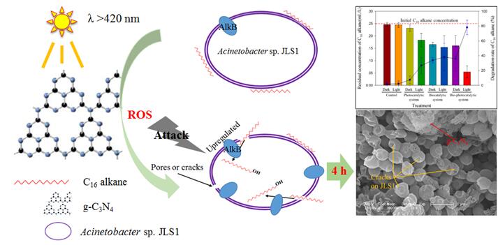 石油污染是當今世界亟待解決的環境污染問題之一,東北地理所環境修復材料與技術學科組于洪文、徐興健等研究人員,針對石油污染修復研究的理論與技術需求,利用從吉林油田污染土壤中篩選出的石油烴降解菌Acinetobacter sp. JLS1和環境友好型光催化劑g-C3N4,成功構建了用于石油烴高效降解的生物-光催化耦聯修復系統(Bio-photocatalytic hybrid system),研究并明確了該系統對石油烴組分中正十六烷(C16alkane)的降解性能及相關機制。