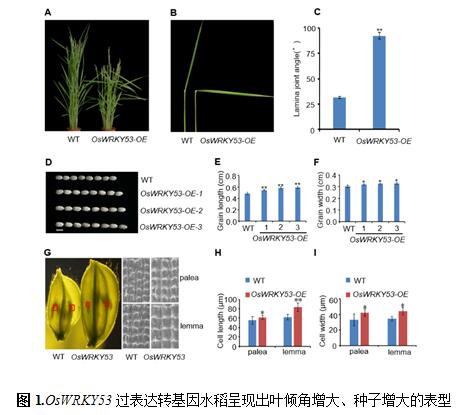 本研究首次發現水稻轉錄因子OsWRKY53能夠正向調控BR信號,OsWRKY53基因過表達轉基因水稻(OsWRKY53-OE)呈現出葉傾角增大、種子增大、其葉傾角對外源的BR處理超敏感等一系列BR信號增強的表型;而敲除突變體(oswrky53)表現出葉傾角變小、種子變小、株高變矮、其葉傾角對外源的BR處理敏感性下降等一系列BR信號缺陷的表型。說明OsWRKY53是BR信號的一個新的正調控因子。