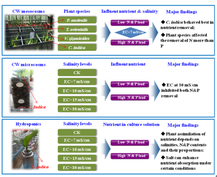 東北地理所水環(huán)境污染與防治學(xué)科組在對人工濕地處理含鹽廢水的國內(nèi)外研究進(jìn)展進(jìn)行綜述性研究的基礎(chǔ)上(Liang et al., Ecological Engineering,2017),開展了人工濕地處理不同類型含鹽廢水的研究工作。研究發(fā)現(xiàn),在栽種適宜的耐鹽植物后,人工濕地可以對含鹽廢水(EC≦15 dS/m)中的氮磷等營養(yǎng)元素達(dá)到較好的凈化效果;鹽度、污染負(fù)荷、濕地結(jié)構(gòu)、共存污染物等均在一定程度上影響人工濕地對氮磷的凈化能力;通過優(yōu)化濕地結(jié)構(gòu)等措施可以保障人工濕地較好的運行效果(Liang et al., Chemosphere, 2017)。