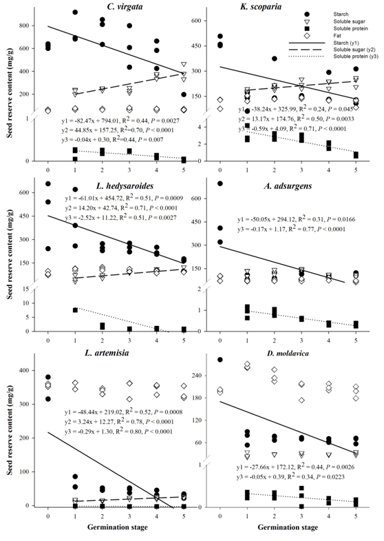 圖1 六個物種淀粉、脂肪、可溶蛋白、可溶糖含量在萌發過程中的回歸分析。0表示干種子,1表示吸脹,2表示1%萌發,3表示50%萌發,4表示最高萌發,5表示早期幼苗階段。