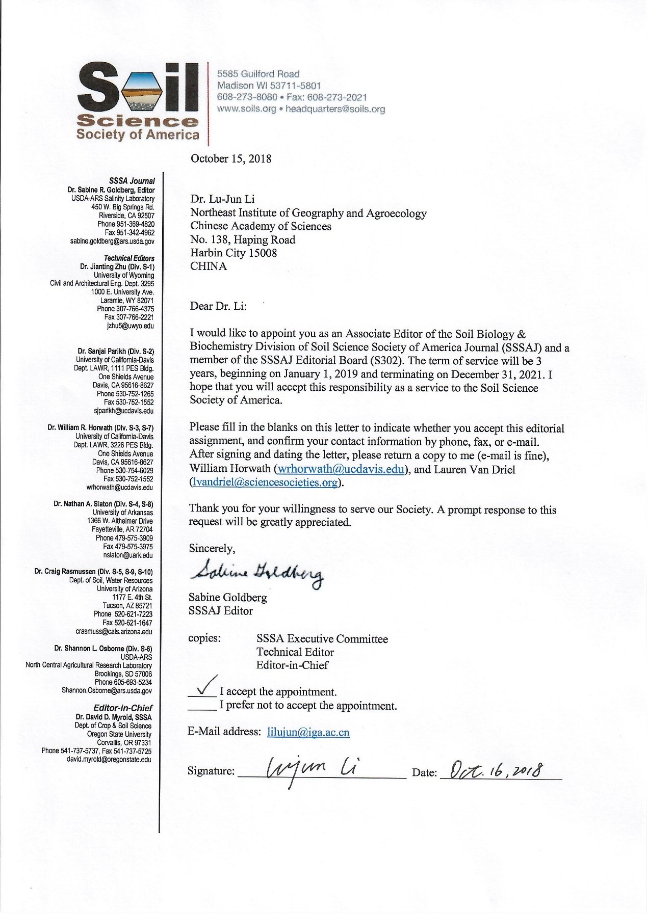 近日,中國科學(xué)院東北地理與農(nóng)業(yè)生態(tài)研究所李祿軍研究員收到了美國土壤學(xué)會會刊Soil Science Society of America Journal(SSSAJ)的正式邀請,擔(dān)任該期刊的副主編(Associate Editor)和編委(S302),任期三年(2019年1月1日至2021年12月31日)。