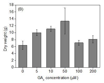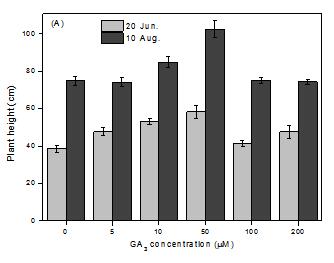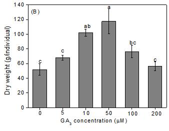 圖2 不同濃度GA3處理對(duì)羊草第一年株高(A)和生物量(B)的影響