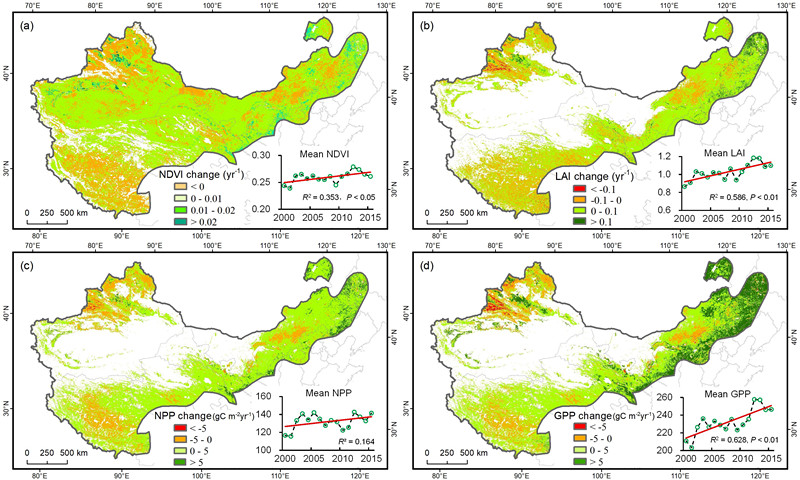 圖 中國干旱-半干旱區(qū)主要生態(tài)系統(tǒng)參量年際變化趨勢