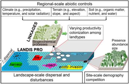 圖1.結合區域、景觀和林分尺度過程的樹種分布耦合模擬方法
