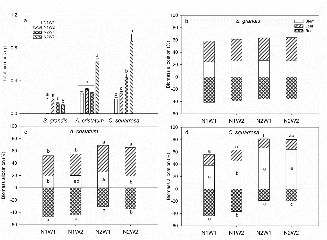 圖1 三個物種總生物量(a)和莖、葉、根生物量分配(%,b-d)對水氮添加的響應(yīng)。N1W1,低氮低水;N1W2,低氮高水;N2W1,高氮低水;N2W2,高氮高水。