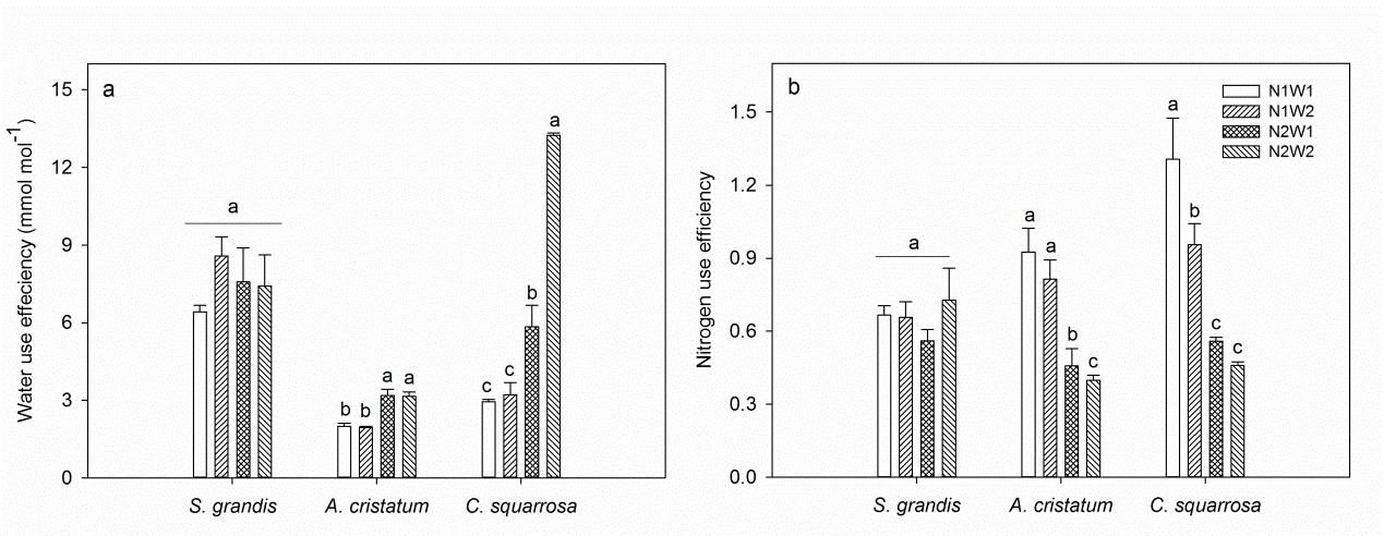 為回答這一科學(xué)問題,東北地理所草地農(nóng)牧業(yè)學(xué)科組以同為多年生叢生型禾草的不同演替階段優(yōu)勢種大針茅、冰草(Agropyron cristatum)和糙隱子草為對象,研究它們幼苗期對施氮處理(0.53和16.25 gm-2y-1 N)、水分處理(田間持水量的50%和70%)及水氮交互作用的響應(yīng)及其生理生態(tài)機(jī)理。研究結(jié)果表明,非退化草場優(yōu)勢種大針茅對水氮添加不敏感,生物量分配、水分和氮素利用效率在不同處理下保持相對穩(wěn)定。而重度退化草場優(yōu)勢種糙隱子草對水氮添加積極響應(yīng),高水和高氮顯著增加其各部分器官的生物量、總生物量及莖的生物量分配(圖1)。糙隱子草在高水高氮條件下的水分利用效率最高,在低水低氮條件下的氮素利用效率最高(圖2)。中度退化草場的優(yōu)勢種冰草的響應(yīng)介于二者之間。不同物種對水氮添加響應(yīng)的策略差異能夠反映它們在不同退化程度草原的分布規(guī)律。全球變化模型預(yù)測未來內(nèi)蒙古草原地區(qū)降雨和氮沉降都將增加,由我們的結(jié)果可以推測,水分和氮素有效性增加有利于內(nèi)蒙古草原退化的恢復(fù),然而這種變化對優(yōu)勢種大針茅不利,其在內(nèi)蒙古草原的優(yōu)勢度很可能降低。