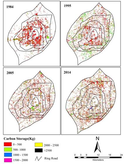 研究團隊綜合應用遙感與實地測量相結合的方法,構建了城市森林碳儲量時空估測模型,揭示了快速城市化過程中城市森林結構及其碳儲量的時空演變規(guī)律。研究發(fā)現(xiàn):快速城市化過程中城市森林覆蓋度總體呈現(xiàn)出逐漸增加的變化趨勢,但其斑塊破碎化逐漸加重;城市森林郁閉度、葉面積、基部斷面積等都呈現(xiàn)出逐漸降低的變化趨勢。在城市森林減緩碳排放方面,研究團隊明確了快速城市化過程中城市森林在應對城市碳排放中的貢獻。在1984~2014年間城市森林碳儲量逐漸增多(大多集中于郊區(qū)),其年增加量為6Gg,可抵消年增加CO2排放量的4%。 城市森林碳密度呈現(xiàn)出從郊區(qū)到中心逐漸降低的變化趨勢,但隨著時間的推移,城市森林質(zhì)量有所提高,城市森林碳密度逐漸升高。相關研究成果可為我國快速城市化進程中合理經(jīng)營、管理城市森林,提高城市森林碳匯能力、應對氣候變化提供重要的數(shù)據(jù)支撐與理論基礎。
