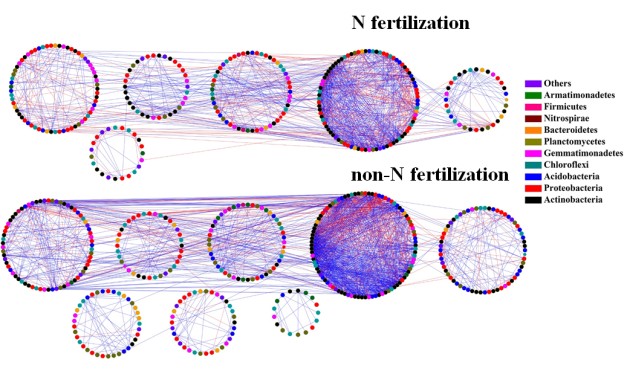 圖2不同化肥處理農田黑土細菌群落(a)和固氮菌群落(b)分子生態網絡圖,每個節點代表1個OTU,也就是相應的細菌/固氮菌物種;不同顏色的節點表示不同優勢細菌/固氮菌類群;藍色線代表物種間的正相關關系,紅色線代表物種間的負相關關系