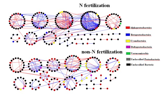 長期以來,化肥施用作為一種主要的農業措施在提高農作物產量上具有顯著成效,但諸多研究表明長期的化肥施加可導致土壤有機質下降、土壤氮流失加重、土壤大面積酸化以及農產品中重金屬超標等問題,同時也會改變土壤微生物群落結構。然而,對于不同種類化肥的施加對微生物群落結構的影響有何異同,尚缺乏系統性的研究。為此,東北地理所農田分子生態學科組與黑龍江省農業科學院土壤肥料與環境資源研究所合作,以長期不施肥(NoF)、單施氮肥(N)、單施磷肥(P)、單施鉀肥(K)、氮磷肥(NP)、氮鉀肥(NK)、磷鉀肥(PK)和氮磷鉀混合肥(NPK)為研究對象,利用新一代高通量測序技術和分子生態網絡分析,分別對上述不同化肥添加下農田黑土細菌和固氮菌群落結構進行解析。結果表明含有氮肥處理(N、NP、NK和NPK)和非氮肥處理(NoF、P、K、PK)的細菌群落和固氮菌群落均明顯分成兩大集團(圖1),其中放線菌門(Actinobacteria)、變形菌門(Proteobacteria)和酸桿菌門(Acidobacteria)是主要的優勢細菌門,慢生根瘤菌屬(Bradyrhizobium)和斯科曼氏球菌屬(Skermanella)是主要優勢固氮菌屬;含氮肥和非氮肥處理的細菌和固氮菌分子網絡結構也存在明顯差異(圖2)。網絡屬性分析發現,含氮肥的細菌網絡和非氮肥的固氮菌網絡雖然結構簡單但更穩定。土壤pH、全氮和速效鉀是調控細菌網絡的主要因子;土壤pH、全碳、全氮和硝態氮是影響固氮菌網絡的主要因子。上述結果綜合表明,在長期施加不同化肥組合處理中,含氮化肥的施加是驅動東北農田黑土細菌和固氮菌群落結構分異的主導因素。
