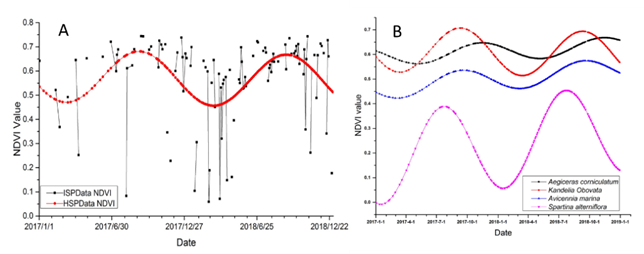 圖1. 建立高質(zhì)量紅樹林植物群落物候曲線(A)及幾種紅樹林群落物候曲線(B)